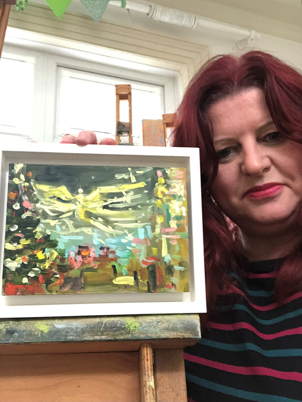 And then, in 2022, after 18 years of ‘no thank you’, and out of 16,500 entries, her large oil Golden Dawn was accepted for their summer exhibition ‘Golden Dawn – across to Tillington Monument, Petworth’ oil 1.2m x 2m